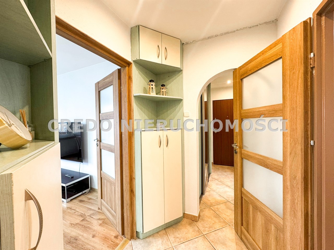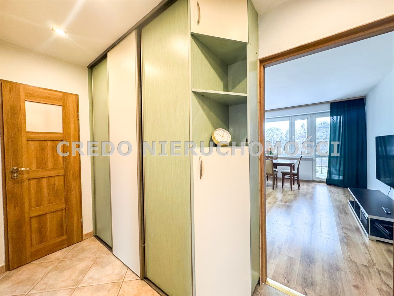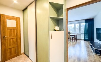 przestronny przedpokój wyposażony w szafy w zabudowie